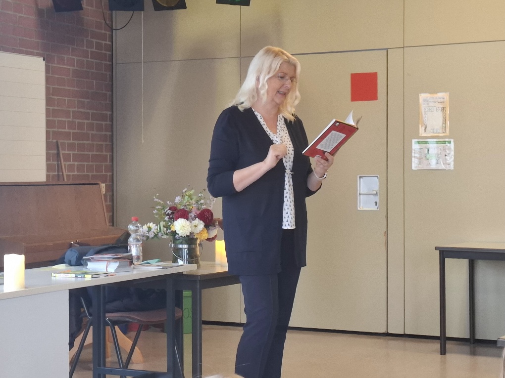 Im Rahmen des Lesefestivals der Nürnberger Stadtbibliothek wurde diesmal auch unsere Schule ausgewählt für eine Autorenlesung mit einer bekannten Autorin: So kam am 29.10. die Autorin Sabine Zett zu uns in die Schule – und es gab drei Lesungen: Jeweils für die Klassen 2, 3 und 4. Frau Zett erzählte von und las „Lesehäppchen“ aus 2 ihrer insgesamt 46 Bücher: „Aus dem Schultagebuch“ – einmal aus der Sicht des Schülers Liam „Zutritt verboten“ und später Erlebnisse von der Schülerin Jella „ Geheimmission Lehrer“. Die Kinder waren begeistert, hingen an ihren Lippen und gaben eifrig mit „Daumen hoch oder runter“ ihre Meinung zum Besten. Es ging bei beiden Büchern um die „Schule der Zukunft“, die Liam und Jella mit ihren Freunden erleben durften. Und da gab es mehr als nur ein Geheimnis zu entdecken – nur leider hörte Frau Zettl immer an den spannendsten Stellen auf zu lesen – warum wohl? Zum Abschluss durften die Kinder noch Fragen stellen und erfuhren, wie so ein Buch entsteht, wer daran beteiligt ist und wie lange das dauert. Dank des Sponsorings durch die Stadtbibliothek Nürnberg brauchte jeder Schüler nur 3 Euro zu bezahlen.