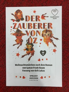 Am Freitag, den 12.12.2025 waren wir im Stadttheater Fürth. Im Weihnachtsmärchen „Der Zauberer von Oz“ lernten wir die kleine Dorothy kennen, die durch einen Wirbelsturm in ein fremdes Land gepustet worden war. Mit der Hilfe einer Vogelscheuche, des Blechmannes und des ängstlichen Löwen meisterte sie allerlei Prüfungen.